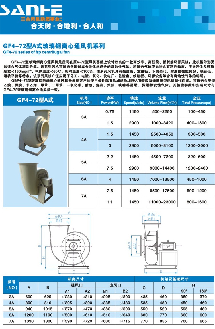 產品說明:GF4-72是我司在原F4-72型風機基礎上設計改良的一款高效率、高性能、低耗能環(huán)保風機。此機型外形更加適合氣體流動性能。GF4-72型玻璃鋼離心通風機是參照金屬4-72型通風機性能參數(shù)基礎上設計改良而采用玻璃鋼復合材質制作而成。該系列風機可輸送含酸堿成分及化學成分的腐蝕性氣體。所輸送氣體不允許含有粘性物質、所含粉塵及硬質顆!150mg/m3、氣體溫度≤60℃、相對濕度≤100%。該系列風機具有強度高、重量輕、不易老化、耐腐蝕性能良好、噪音低、運轉平穩(wěn)等特點。是一種高效率、高性能、低耗能通用型防腐風機。該系列風機廣泛應用于化工、電鍍、氧化、發(fā)電廠、化驗室、線路板、環(huán)保設備等含有腐蝕性氣體的場所。